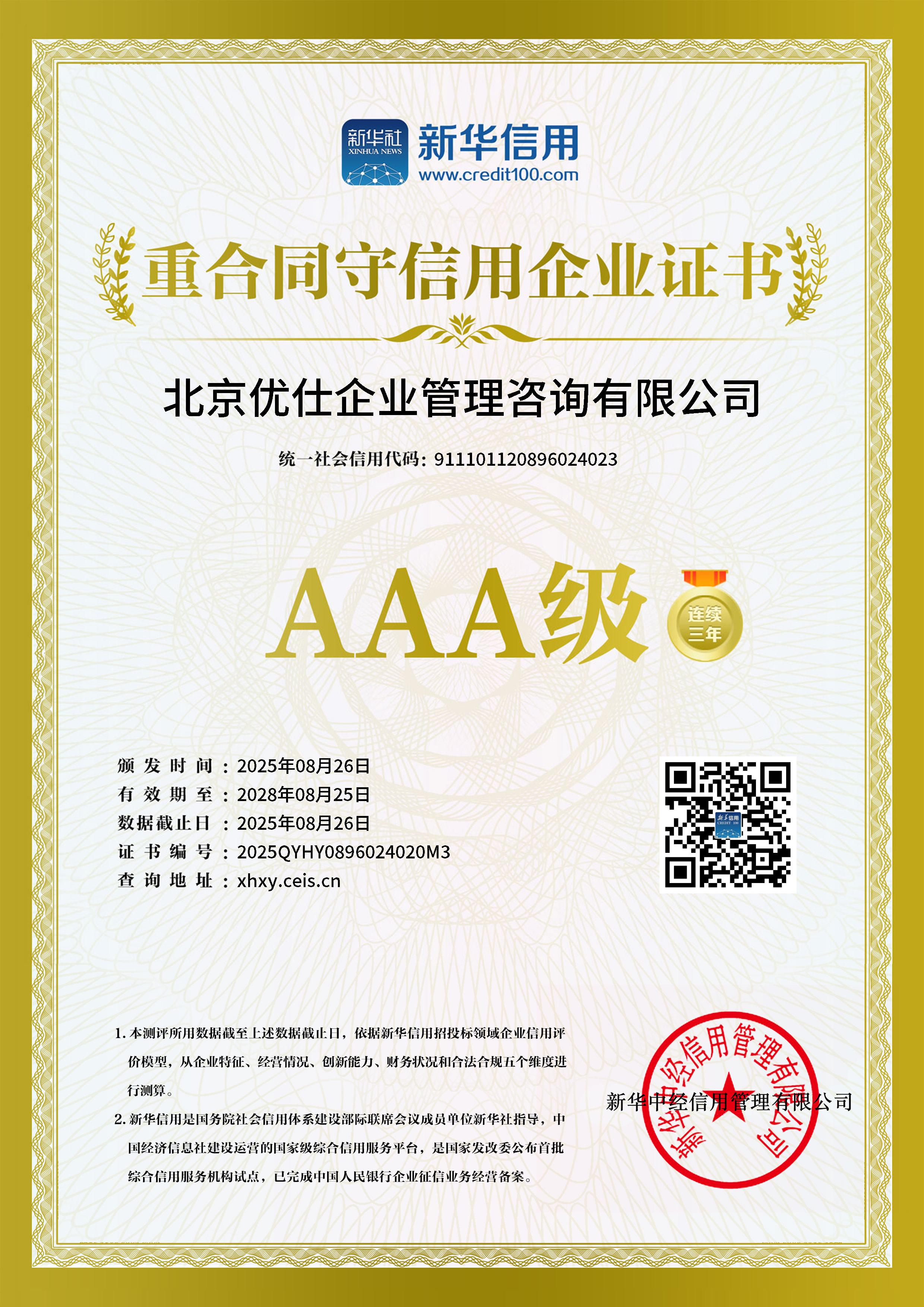 2025年,北京优仕企业管理咨询有限公司获得由第三方新华信用(是由新华社中国经济信息社建设运营的信用信息服务平台)评价机构依据相关标准,对企业在合同履约、商业信誉、社会责任等方面进行综合评估后授予的等级信用认证。其中,“AAA”代表信用等级,这意味着该企业在过往经营中始终恪守契约精神,诚信至上,并无重大违约记录。